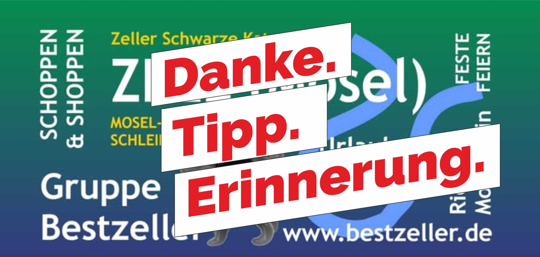 So aktuell wie www.bestzeller.de ist auch die "Gruppe Bestzeller" in Facebook. Schauen Sie mal rein und werden Sie Mitglied! Nutzen Sie das Medium auch für die Meldung eigener Aktivitäten und Veranstaltungen in Zell!https://www.facebook.com/groups/566031623417981/Hintergrundfoto: Arne Houben, RMV-Rhein-Mosel-Verlag, Zell (Mosel), www.r-m-v.de/