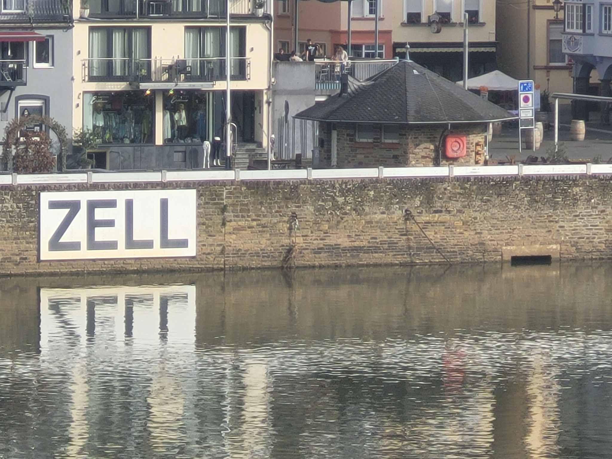 Der schöne Blick vom schönen Kaimt auf das nicht minder schöne Zell schließt mit dem ZELL-Schild an der Hochwassermauer mit Ober- und Unterkante sowie den Querlinien der Buchstaben eine praktische grobe Pegel-funktion ein. Das Foto zeigt den ungefähren normalen unteren Moselstand bei rund 3 m in Trier.