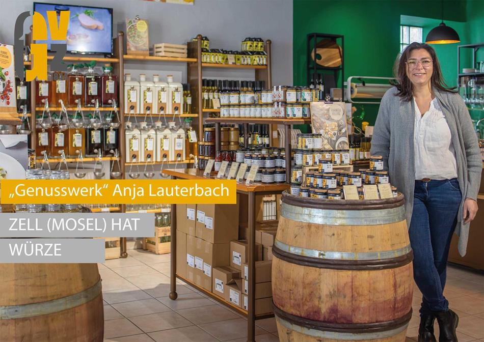 Den passenden Laden für die Erfüllung meines Traumes fand ich in der Fußgängerzone in Zell (Mosel) und so entstand der Laden „Genusswerk-Zell“ in der Balduinstr. 30, mit direktem Blick auf das Wahrzeichen der Stadt, dem „Runden Turm“. Die Produkte stammen von der Wajos GmbH aus Cochem und der Weinmanufaktur Walter Oster aus St. Aldegund, der Honig kommt aus der Imkerei Boris und Bernd Kretz aus Bullay.