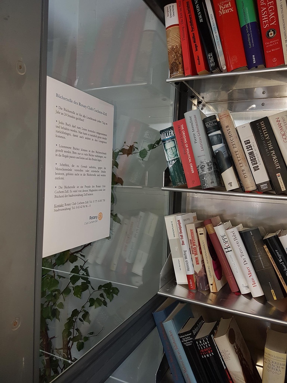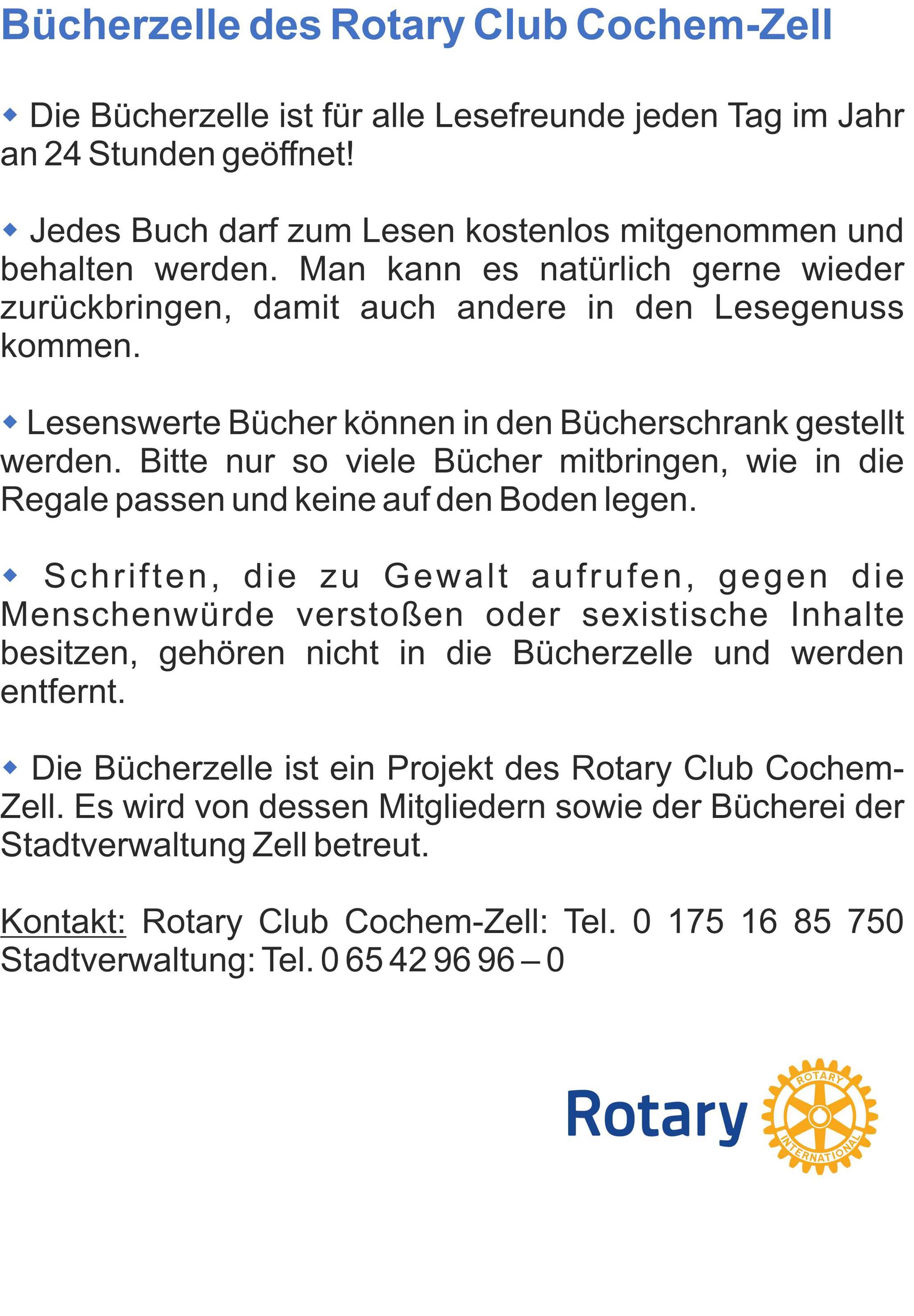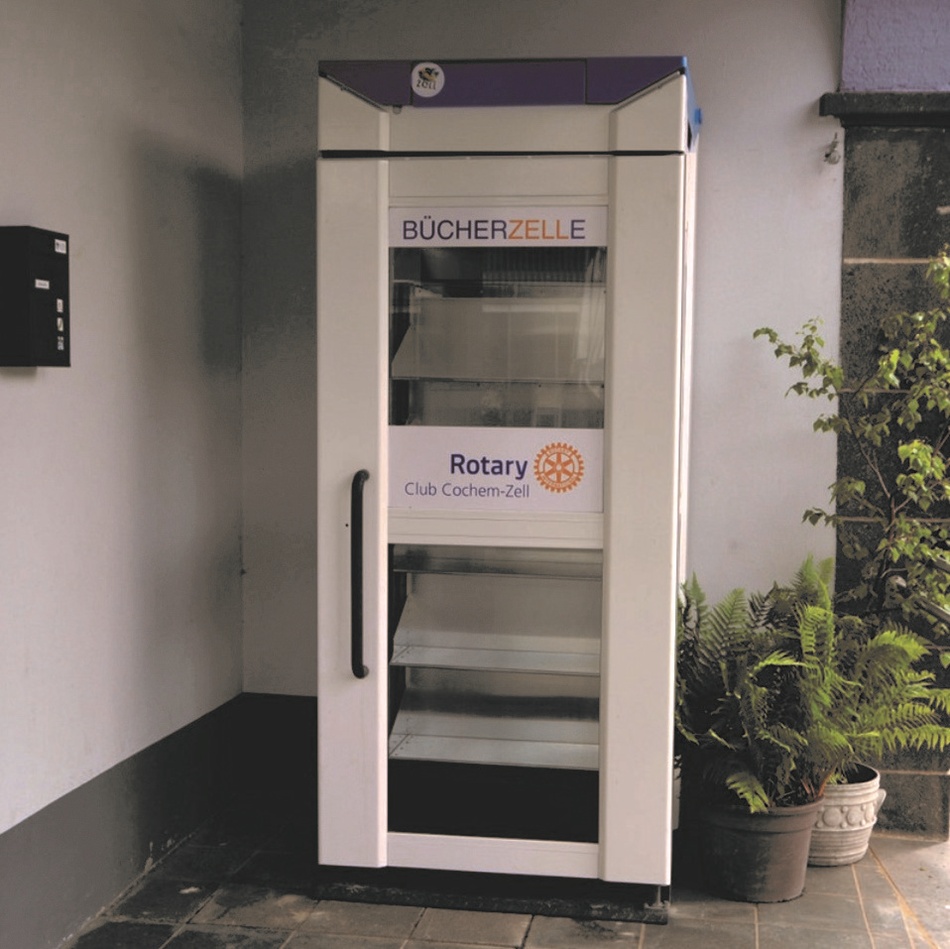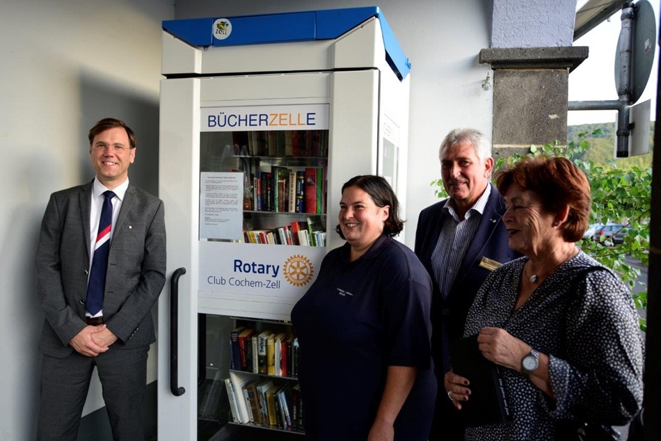 Die Bücherbox wurde Anfang August 2019 in Anwesenheit einer Delegation des Rotary-Clubs Cochem-Zell offiziell ihrer Bestimmung übergeben. Die Beigeordnete der Stadt, Frau Rosemarie Mandernach überreichte symbolisch ein Exemplar aus ihrem Bücherbestand mit den besten Wünsche für ein gutes Gelingen der Aktion.